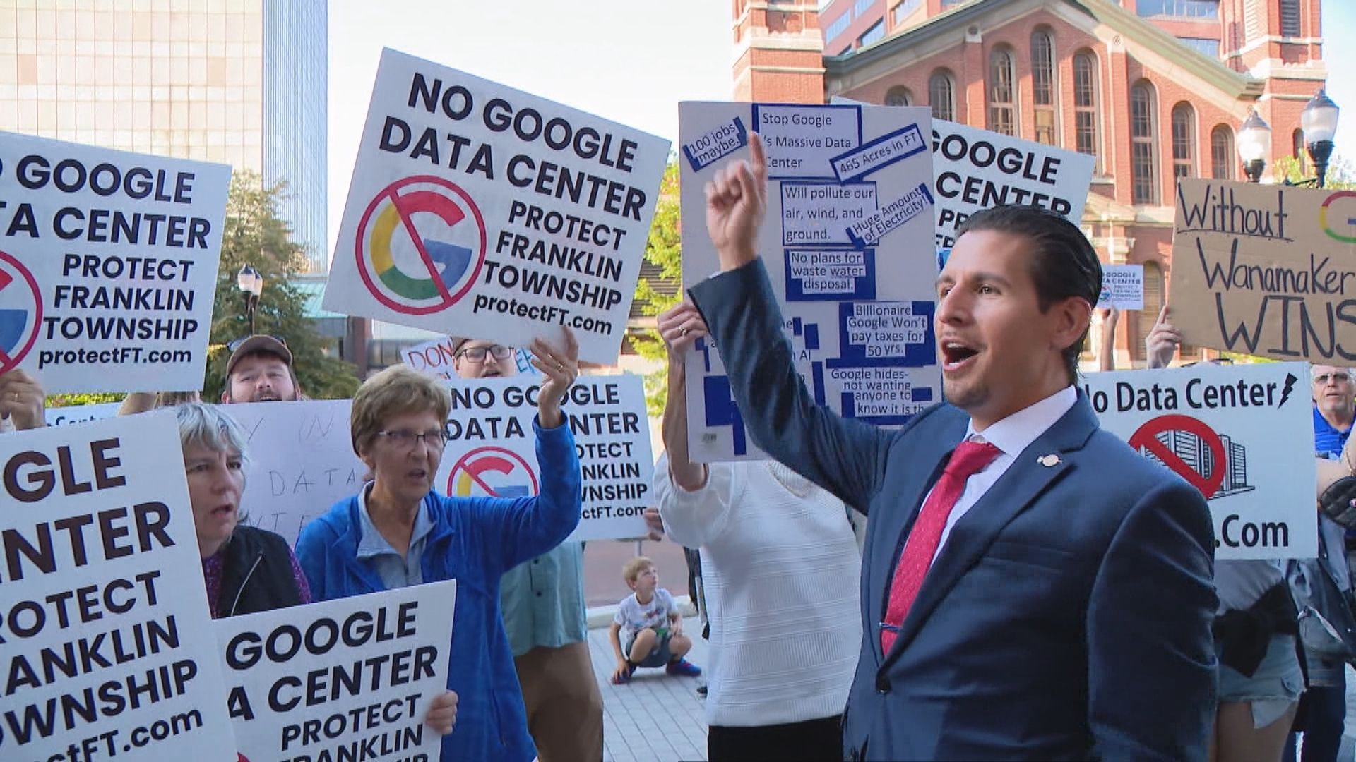 Protestors rally against Google’s proposed Franklin Township data center at a previous City-County Council meeting. Credit: WTHR
